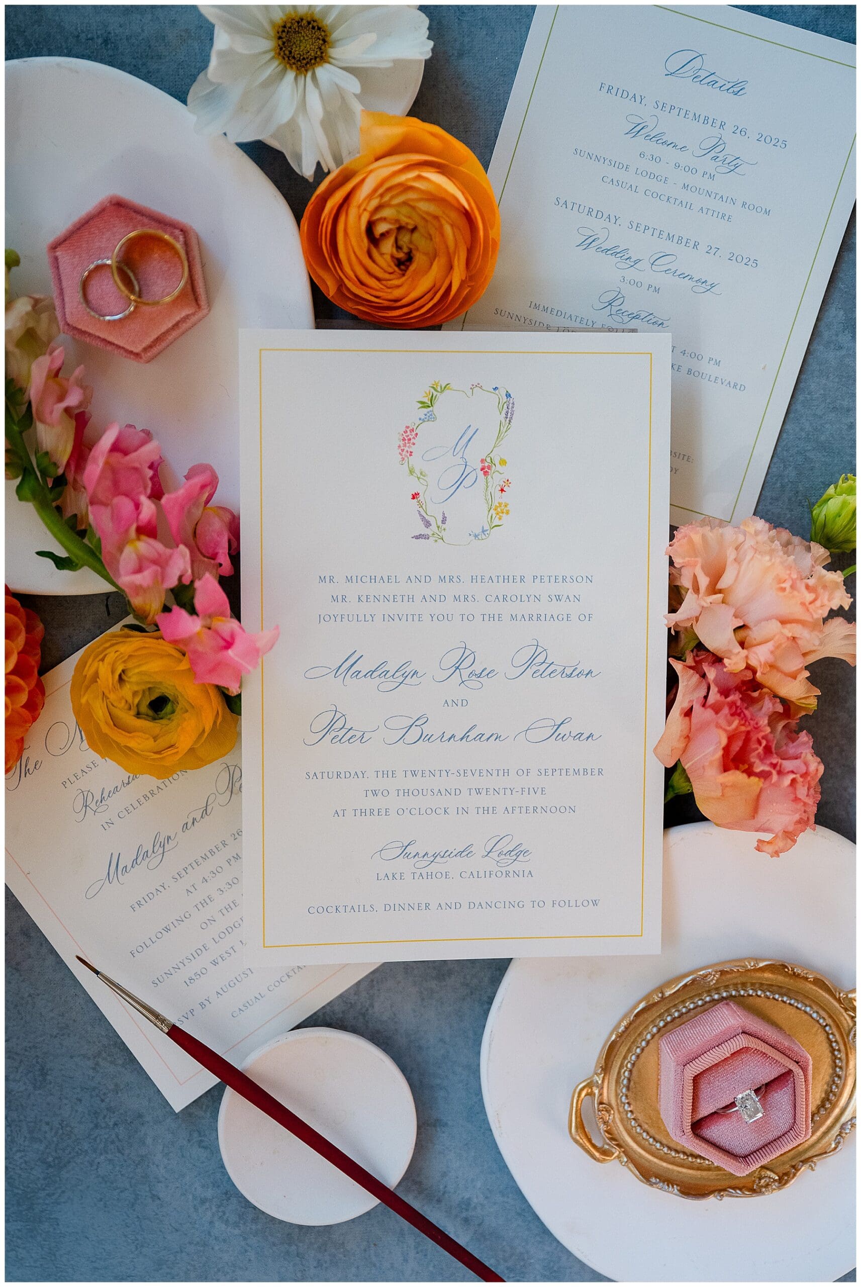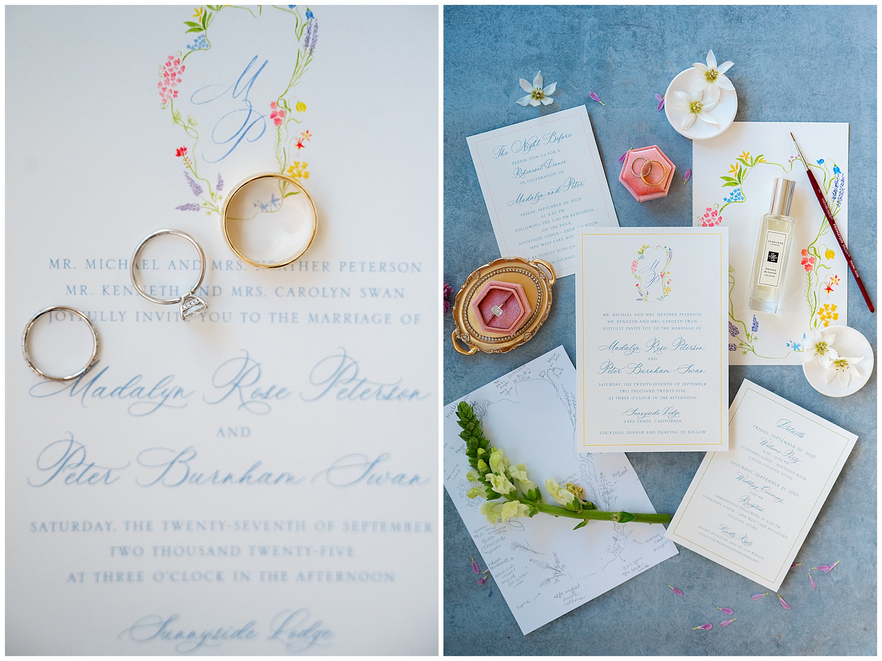 One of the most unique design elements was the custom wedding crest, which Maddy hand-painted in watercolor. Her artistic vision tied the day together beautifully — from the invitations and signage to the soft color palette and décor throughout the reception space at Sunnyside Resort in Lake Tahoe.