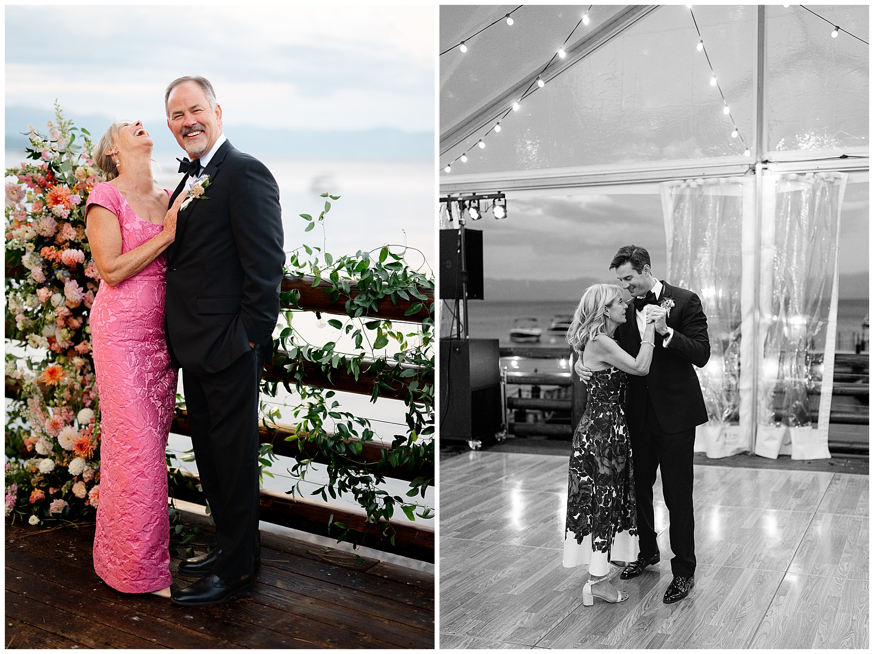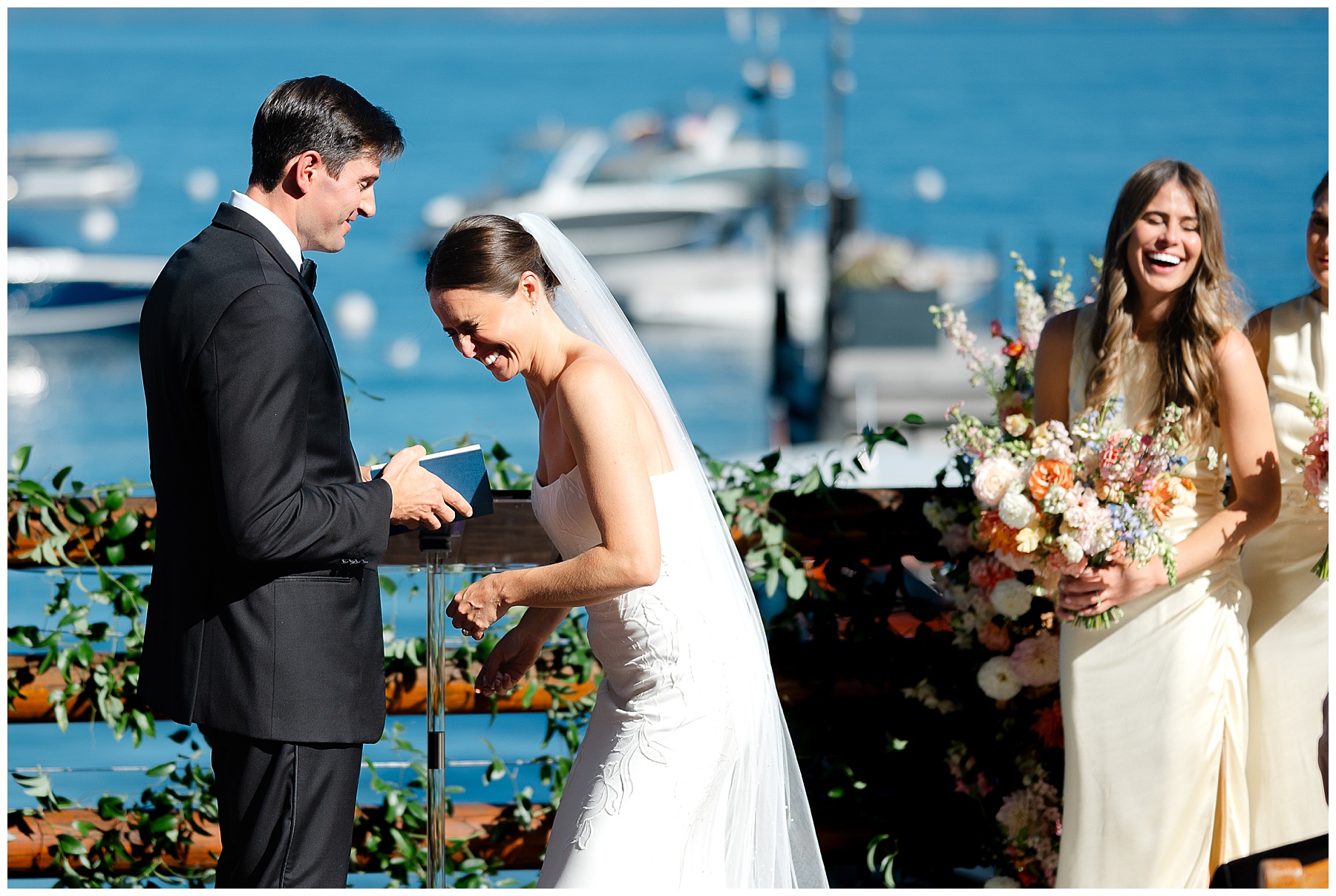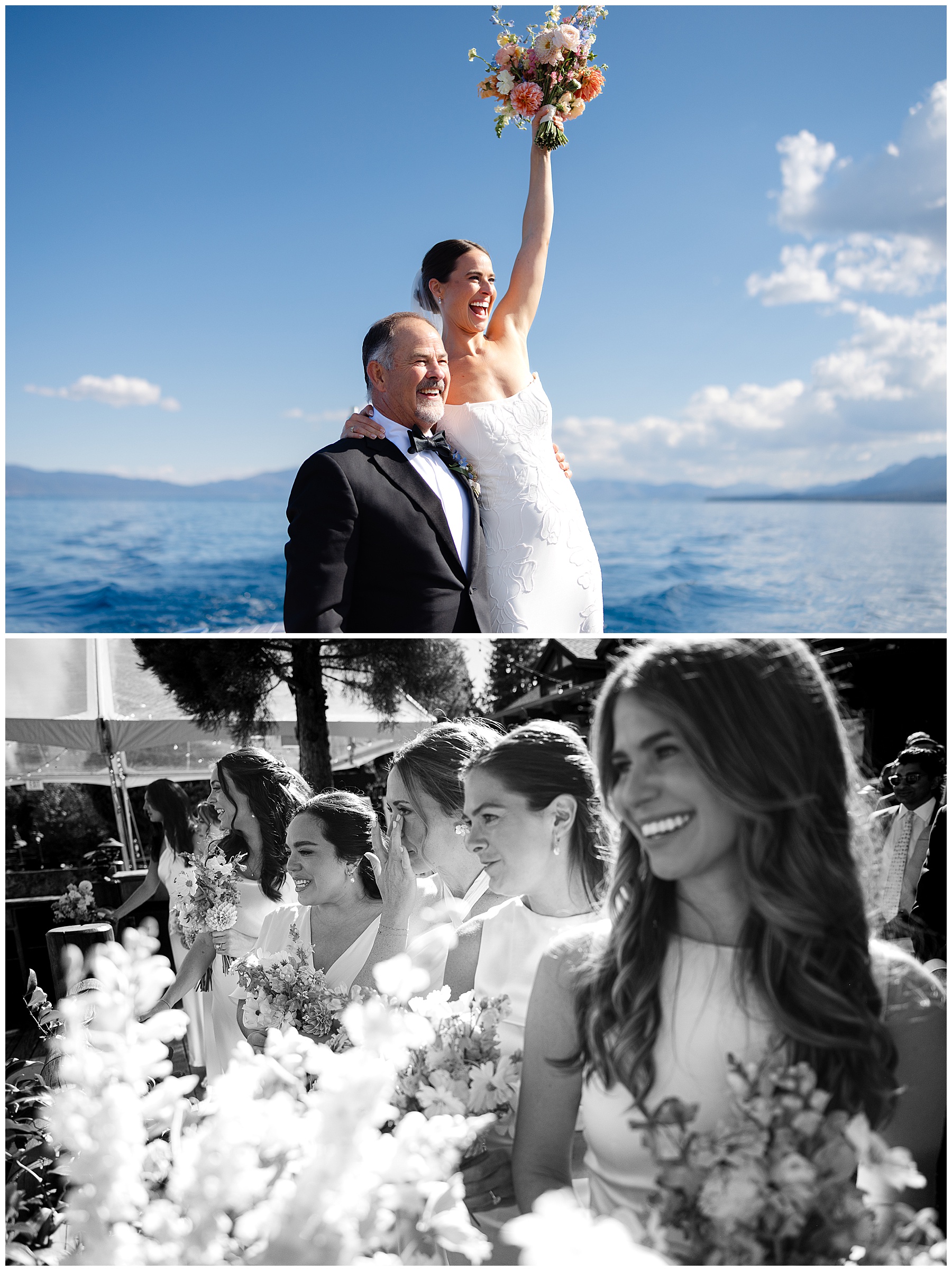 Back at Sunnyside, Maddy shared an emotional moment with her father before arriving by boat for her ceremony entrance. As they pulled up to the dock, guests were overcome with emotion — happy tears all around as they watched such a meaningful, cinematic entrance unfold against the stunning backdrop of Lake Tahoe.