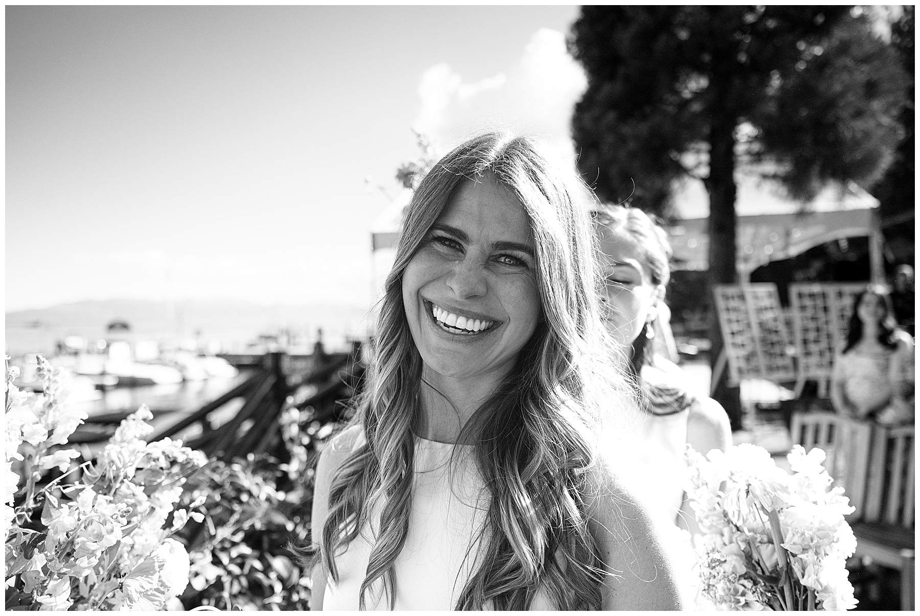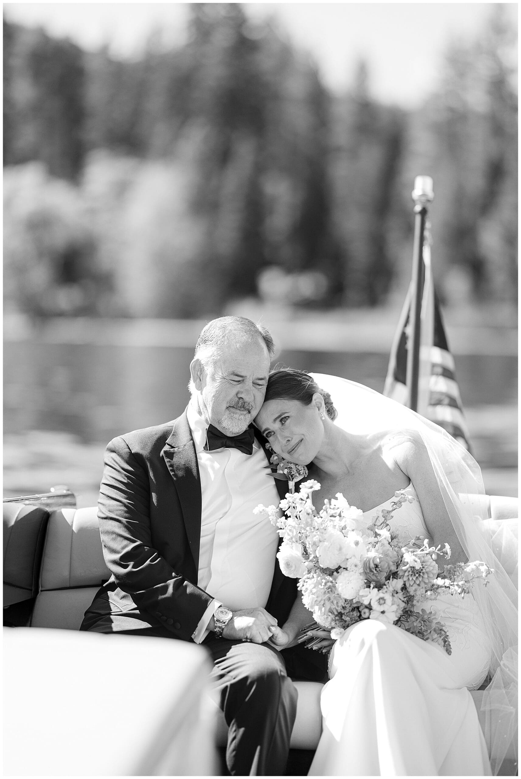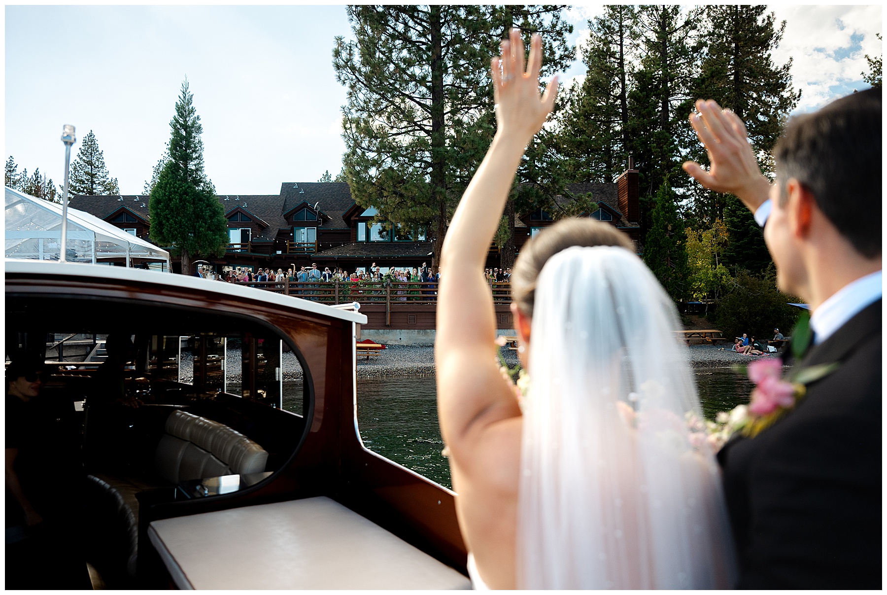 Bride arriving by boat for Sunnyside Lake Tahoe wedding ceremony